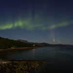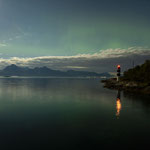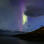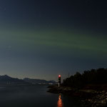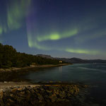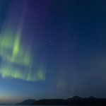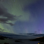 Leider, leider war es auch diesmal wieder so wie am Abend vorher, dem 5. September auf Sommarøy. Auch da begann das Nordlicht früh, aber sehr schwach. Ein paar Mal wurde es stärker und wir hofften schon auf mehr. Aber daraus wurde nichts. Bereits gegen 23 Uhr war alles vorbei und kam auch später in der Nacht nicht wieder. So war es halt auch gestern Abend. Um 20 Uhr standen wir auf der Felsplattform mit vorbereiteter Kamera bereit. Helga gibt gegen 21:30 Uhr auf, sie möchte noch bei dem letzten Restlicht zurück zu Leo. Sie scheut sich, später bei völliger Dunkelheit über die unebenen Felsen zu gehen - auch, wenn wir natürlich Taschenlampen dabei haben. Gegen 22 Uhr zeigt sich ein zaghaftes Licht, ein Halbkreis der vom gegenüber liegenden Ufer bis über die Berge hinter uns reicht. Schnell verblasst es ... und das wars.