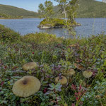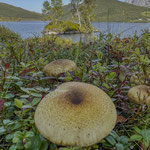 Das Dörfchen Skrolsvik hat einen Stellplatz direkt am kleinen Hafen, von wo aus wir gerade den Sonnenuntergang beobachtet haben. Nicht ohne vorher einen Abstecher nach Rødsand zu machen, auch ein nettes Fischerdörfchen. Die Straße führt vorbei an dem hübsch gelegenen See "Olaheimvatnet". Unzählige Pilze wachsen an dessen Ufer ... leider haben wir keine Ahnung von Pilzen. Diese Menge würde ein schönes Abendessen ergeben. Aber nein - lieber nicht!