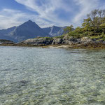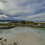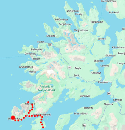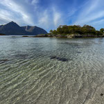 Es ist schon ein wenig dran an der romantischen Beschreibung. Die beiden Inseln mit dem sie umgebenden Schärengarten aus unzähligen winzigen Inselchen strahlen ein südliches Flair aus mit dem kristallklaren, türkisfarbenen Wasser und den hellen Sandstränden. Schön und friedlich ist es zur Zeit. In den Sommermonaten wird es wohl ähnlich überlaufen sein, wie die Riviera. Immerhin ist Tromsø dicht bei.