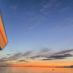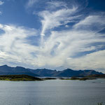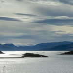 Nach erneutem vergeblichen Warten auf Polarlichter gestern Nacht trotz wolkenlosem Himmel brauchen wir heute gar nicht erst damit zu rechnen. Jetzt am Abend herrscht dichte Bewölkung, dabei war der Tag strahlend sonnig und warm. Himmel, Meer und Berge verschmolzen in einer Sinfonie von Blautönen. Wunderschön.