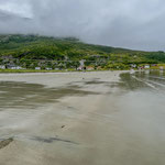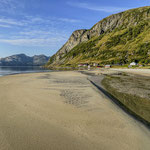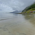 Für nord-norwegische Verhältnisse hat die Werbung für diesen Ort nicht zu viel versprochen. Eine hübsche Bucht mit feinem, hellen Sandstrand, von dem aus man direkt in Wasser laufen kann ohne über Geröll balancieren zu müssen. "Könnte" müssen wir sagen, denn leider haben wir keine Badesachen dabei und ein paar - wenn auch wenige - Leute laufen herum. Trotzdem ist es schön hier und zum Nachmittag hin stiehlt sich die Sonne durch den am Morgen herrschenden Nebel. Die Vorhersage verspricht für die Nacht wolkenlosen Himmel und zu allem Überfluss soll es eine relativ starke Sonnenaktivität mit einem KP-Index von 5 geben. Dann ist schon klar, dass es für uns eine lange Nacht werden wird. Denn, sollte sich das Nordlicht zeigen, wollen wir es nicht verschlafen.