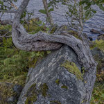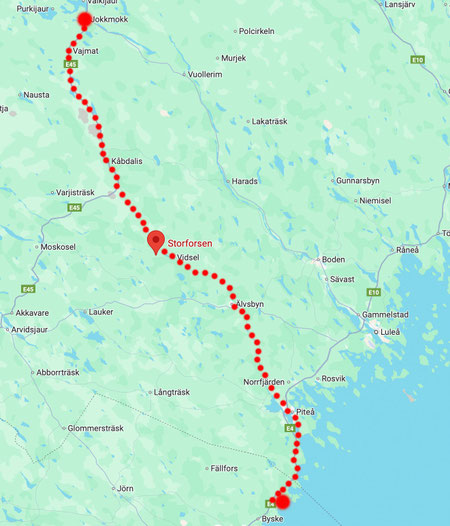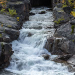Auch auf den zwei vorherigen Nachtplätzen standen wir allein und ruhig in einiger Entfernung von der Europastraße 45: am Kaitumelven bei Lappeasuando und am See Vajkijaure, rund 5 Kilometer vor Jokkmokk. Das Wetter ist durchwachsen, zuerst strahlender Sonnenschein am Kaitumelven, dann gestern Nacht und am Vormittag Regen. Da können wir den Plan, das Storforsen Naturreservat noch einmal zu besuchen, wohl aufgeben. Aber im Laufe der Fahrt hört der Regen auf, es ist nicht besonders kalt und windstill ... Glück gehabt. So können wir den kleinen Spazierweg zu den Stromschnellen des Flusses Piteälven "Storforsen" gut machen.