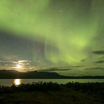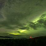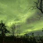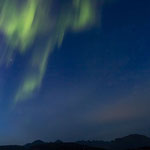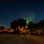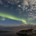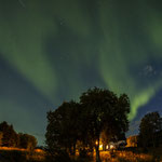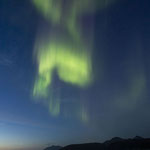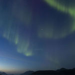In der letzten Nacht war der Himmel sternenklar. Beste Voraussetzungen um das Polarlicht zu sehen. Und ja, wir werden nicht enttäuscht. Fast um die gleiche Zeit wie die Nacht zuvor erscheint es grün über uns. Und diesmal ist es sogar etwas stärker. Um Halbzwölf ist Schluss. Heiko hat wohl eine Ahnung, dass das noch nicht alles war. Irgendwann mitten in der Nacht ein Kontrollblick durchs Fenster - und schon steht er mit Kamera bewaffnet wieder draußen. Die Luft ist relativ milde für diese Breiten und fast windstill. Da frieren einem nicht fast die Finger ab, wie vor drei Jahren, als es nachts sehr kalt wurde. Super!