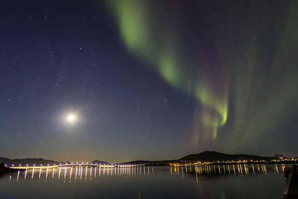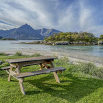 Eine kurze Sightseeing Tour nach Brensholmen machen wir trotzdem und entdecken dabei wieder einmal wunderschöne Panoramen. Zudem hatten wir gestern versäumt, die Sommarøybrua zu fotografieren, was wir nun nachholen. Zurück auf Sommarøy nehmen wir diesmal den anderen der zwei auf den Inseln befindlichen Campingplätze. Der gestrige "Silent Camping" war klein und familiär, dieser hier ist größer und offener. Falls es wider erwarten auch diese Nacht Polarlichter geben sollte, sind sie so vielleicht schneller zu sehen.