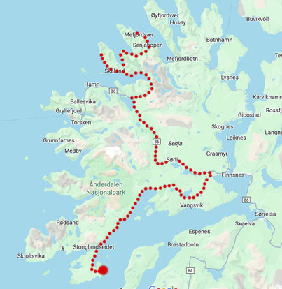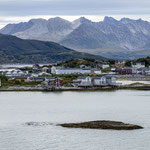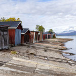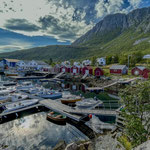 Die Strecke zu unserem heutigen Ziel nach Lekangneset, einem unserer Lieblingsplätze, von dem wir schon mehrfach im Blog berichtet haben, führt entlang der Nationalen Landschaftsroute. Es geht vorbei an "Okshornan" einer der interessantesten Felsformationen auf Senja, aufgrund der spitzen Formen auch "Teufelszähne" genannt. Beim Ort Bergsbotn bietet eine Aussichtsplattform ein schönes Panorama über den Bergsfjord. Und wir machen einen Abstecher nach Skaland und Bøvær. Hier liegt auf einem mit einem Damm mit dem Festland verbundenen Inselchen das "Kråkeslottet" also das "Krähenschloss". Das Gebäude war ursprünglich ein traditioneller Fischereibetrieb und wird heute in den Sommermonaten für Kunstausstellungen und Konzerte genutzt. Das kleine Ensemble von Häuschen, Leuchtfeuer und Damm mit dem leuchtend grünen Hafenbecken bietet immer aufs Neue ein pittoreskes Fotomotiv.