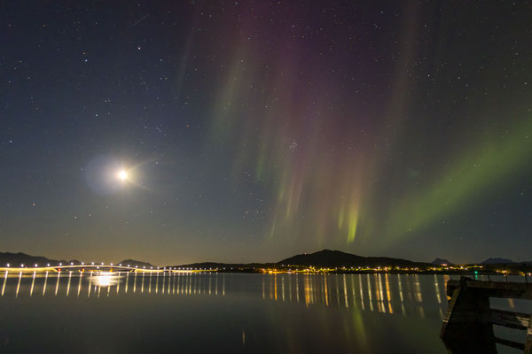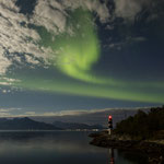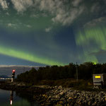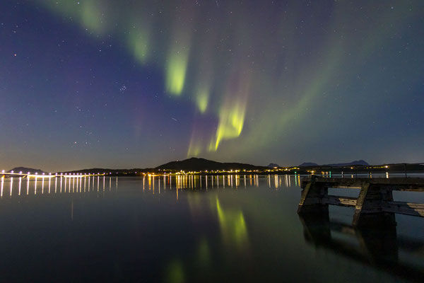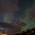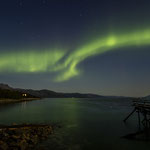 Vorgestern hatten wir überhaupt nicht damit gerechnet, dass es Nordlicht geben könnte. Trotz des wolkenlosen Himmels tagsüber zog am späten Nachmittag eine dichte Wolkenecke auf. Da dringt kein Nordlicht durch. Tja, und wie das manchmal so ist, richtet sich die Natur nicht nach den eigenen Erwartungen. Irgendwann wird die Wolkendecke dünner und reißt an mehreren Stellen auf. Gegen 22 Uhr dann ist es soweit - erst zaghaft, später etwas kräftiger - zieht Bovrost, die Götterbrücke, über uns dahin. Das Licht kommt aus verschiedenen Richtungen. Leider verderben ein wenig die Stromleitungen und die Beleuchtung einige Bilder, wenn das Licht aus dieser Richtung erscheint.