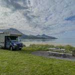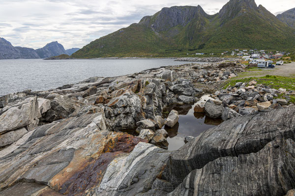Von Brensholmen aus ging es direkt weiter nach Mefjordvær zum Stellplatz am Fjord. Ein paar WoMo's standen schon hier, aber längst nicht so viele wie im letzten Jahr - aber das war im August.