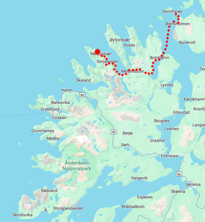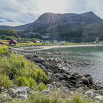 Wir sind uns am Morgen nicht schlüssig, was wir heute machen wollen. Eigentlich war vorgesehen, die Fähre von Brensholmen nach Botnhamn auf Senja zu nehmen. Aber obwohl volle Sonne herrscht und es mit 18° angenehm warm ist, ist es stürmisch. Weiter draußen tragen die Wellen weiße Schaumkronen. Da verschieben wir die Fährfahrt lieber auf morgen und bleiben für heute noch auf Sommarøy.