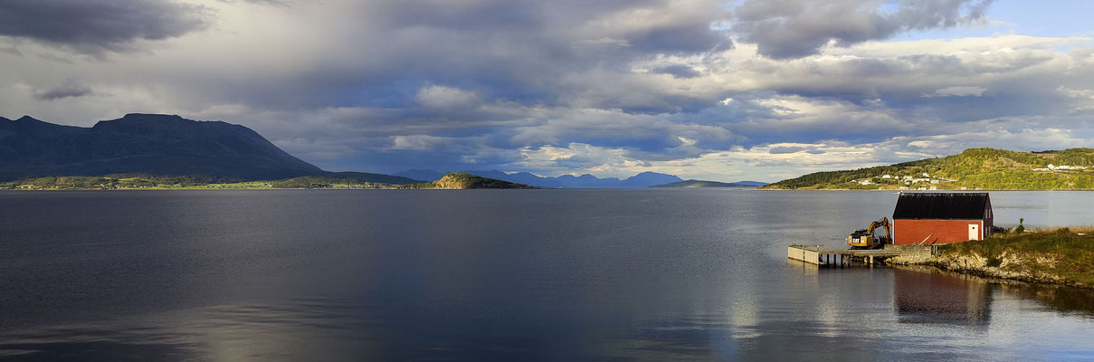 Für heute Nacht haben wir uns einen Platz ausgesucht, der auf den ersten Blick überhaupt nicht einladend wirkt. Es handelt sich um den alten Fähranleger, der nach der Fertigstellung der Brücke nach Sandsøya ausgedient hat. Die Einwohner der Insel scheinen hier all ihren Schrott abzuladen, jedenfalls sieht es aus, wie auf einem Schrottplatz. Zweimal kommen Leute mit Pkw's, einfach um zu schauen, ob was Brauchbares dabei ist. Einer nimmt eine Ladung alter Reifen mit. Wahrscheinlich ein Bauer zum Abdecken einer Miete - oder wozu benötigt man sonst abgefahrene Reifen? Später kommt ein Trecker mit Anhänger und lädt seine Fracht dazu. Aber uns stört das nicht weiter. Wir stehen weit hinten, hinter dem Schrotthaufen dicht am Wasser und parken so, dass wir von unserem "Wohnzimmer" aus den vollen Blick auf den Fjord haben. Das da vorne sehen wir nicht.