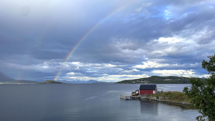 Wir sind heute erst spät in die Gänge gekommen und die Fahrt entlang der Küstenlinie dauert wie immer hier in Norwegen länger als man glaubt. Deshalb entscheiden wir uns, die Fähre erst morgen zu nehmen und bleiben für heute Nacht auf einem Parkplatz kurz hinter Harstad mit einer herrliche Aussicht auf den Ford und werden von einem Regenbogen begrüßt.