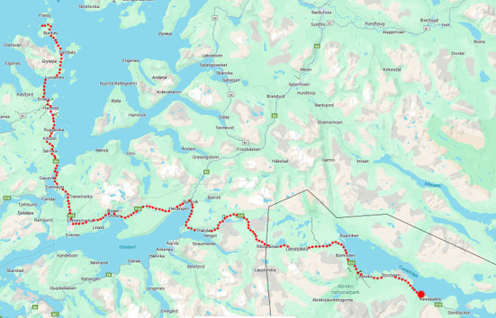 Wir sind nun langsam aber sicher wieder auf dem Weg nach Hause. Von Bjarkøya geht es zurück über Harstad und die Tjeldsundbrücke auf die E10, die uns nach Schweden bringt. Die Bäume tragen Herbstlaub, die Temperaturen liegen im Moment noch zwischen 11 und 7 Grad tagsüber, nachts soll es ca. 5 Grad werden. Aber schon in der nächsten Woche ab Mittwoch geht es auf Minusgrade in der Nacht zu. Aber dann werden wir ja schon wieder weiter südlich sein.